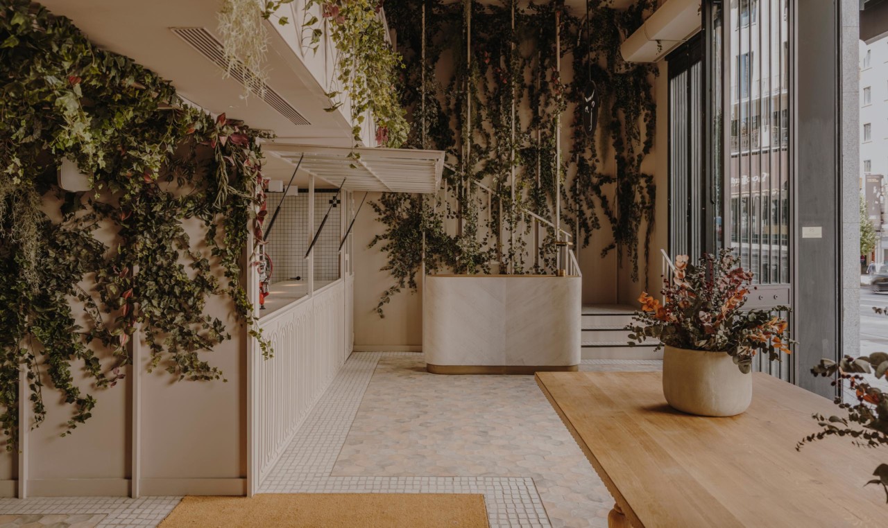 Guests enter Gran Vía 55 via the grand entrance hall where the main staircase, designed in a light-coloured paleXe and wreathed in plants, conveys guests to their culinary experience. Here, organic green tones encircle the main bar and patio which connects all restaurants.